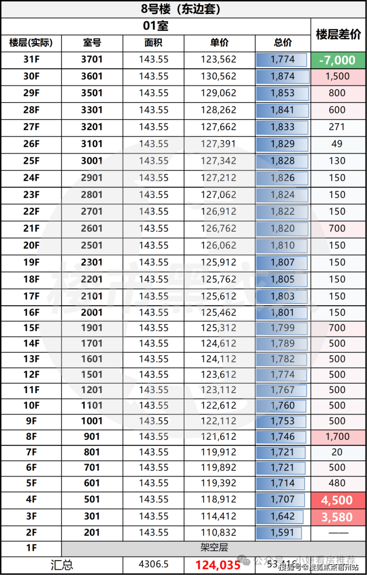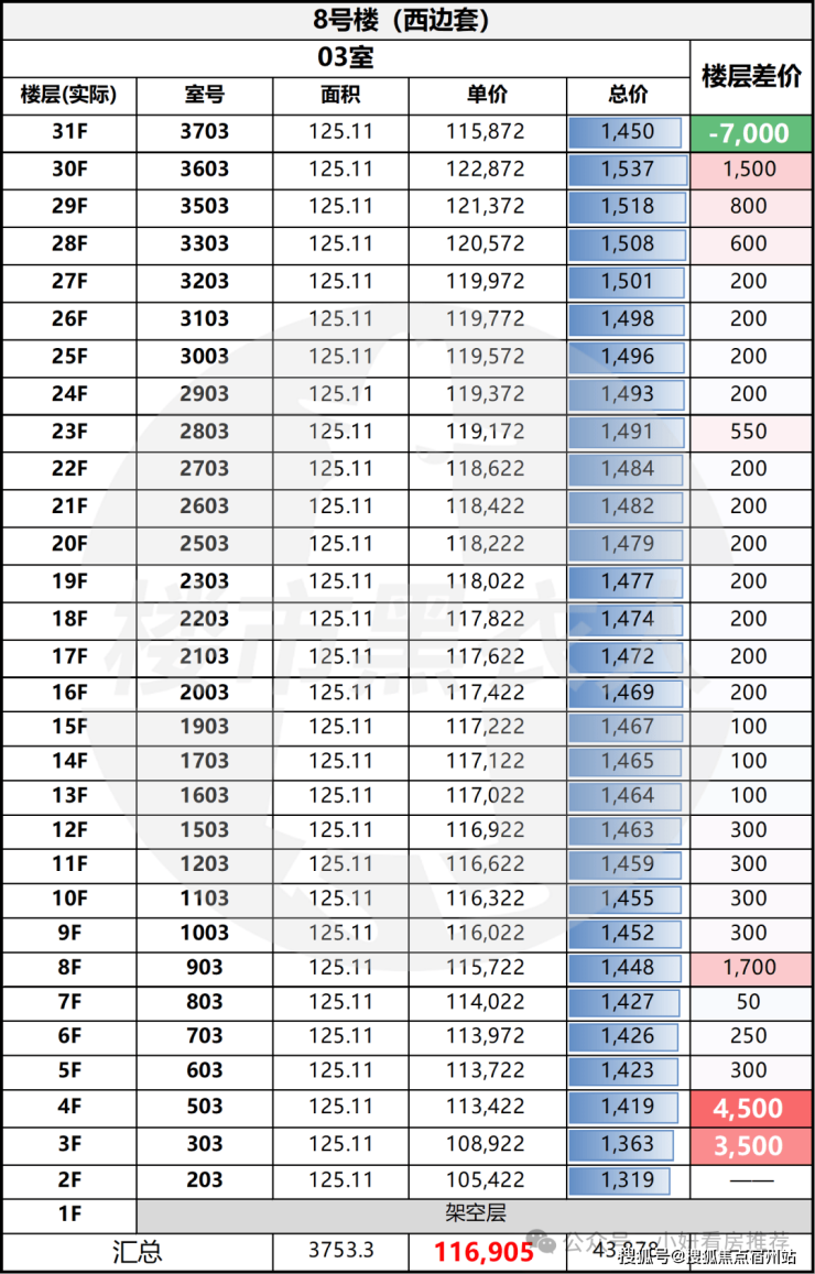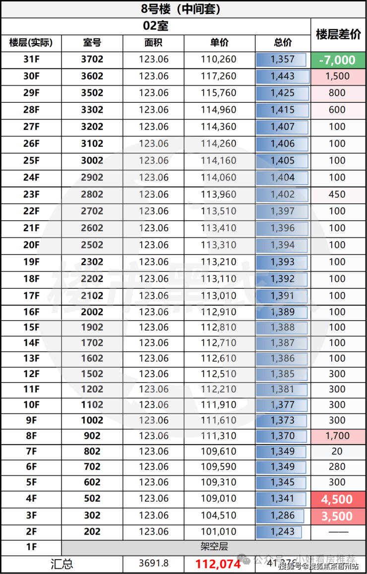 把8# 整栋的一房一价整体来看,你会发现它的定价并不是“均摊”而是很有方向感: