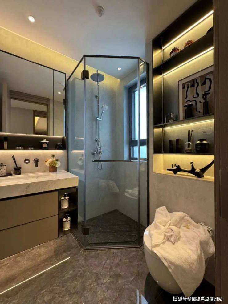 而人行线路则由星级酒店式的入户大堂进入,接着便是6S会所环绕的下沉式水景庭院,约7米高磅礴大气的水景墙配合乌桕林和原石、浮桥交错的地面水景,若是傍晚归家,还能欣赏倒映在水中的点点星光,可谓满满的奢雅意境和尊贵仪式感!