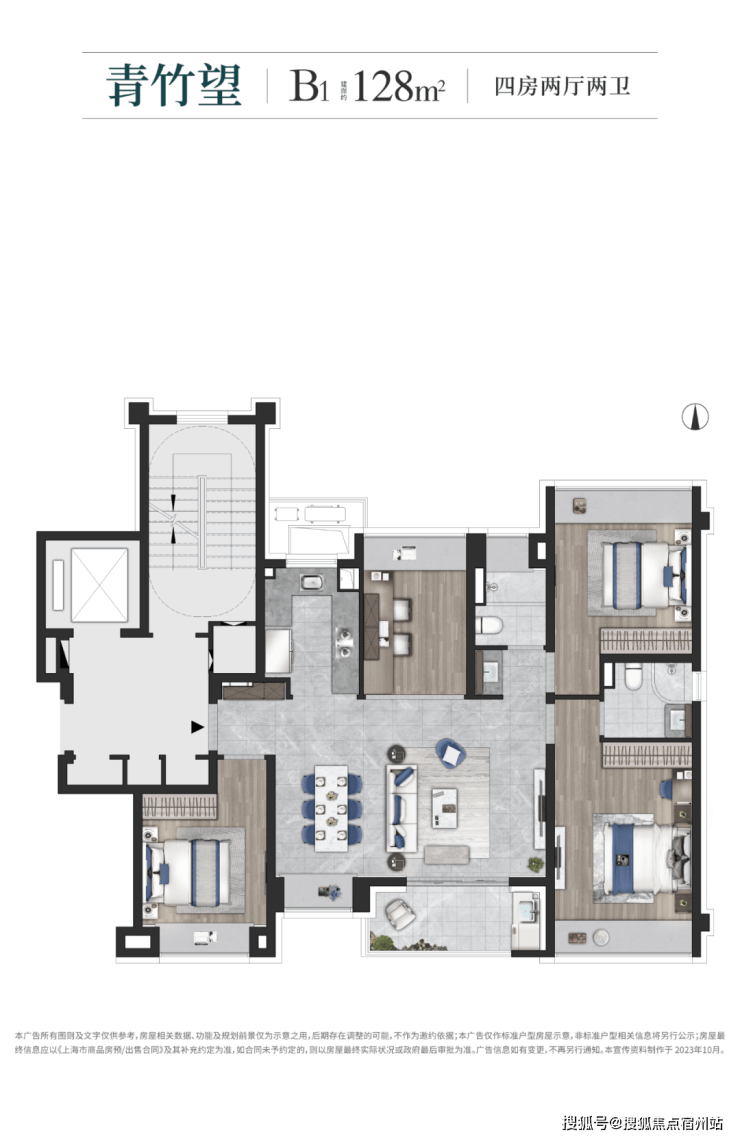 建面约128㎡的四房设计,在空间上使用功能更加扁平化,一站式解决了家庭生活的所有功能,优化居家动线,大大提升空间的居住体验。