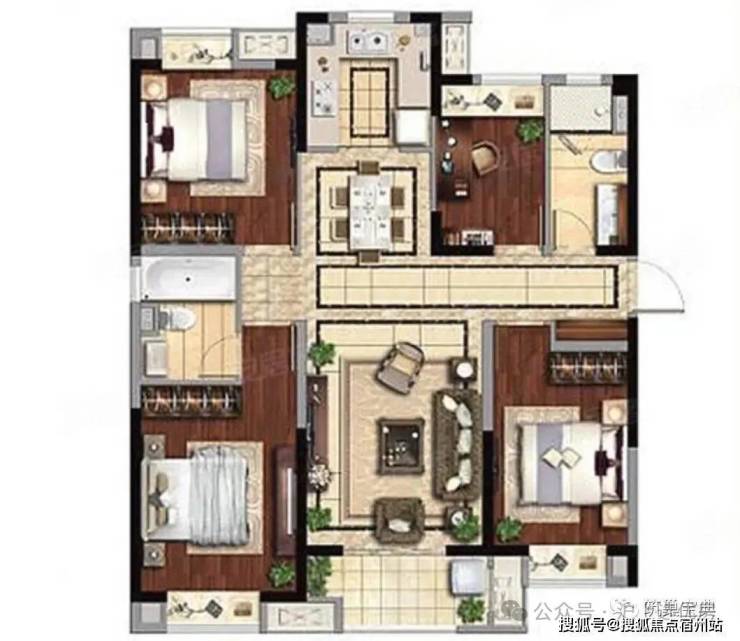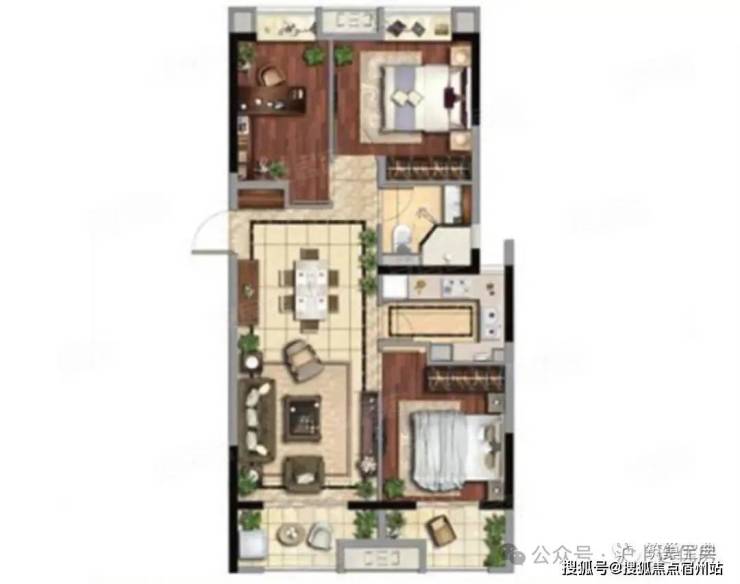 【3】卧室门相互正对、厨房开口正对餐桌。