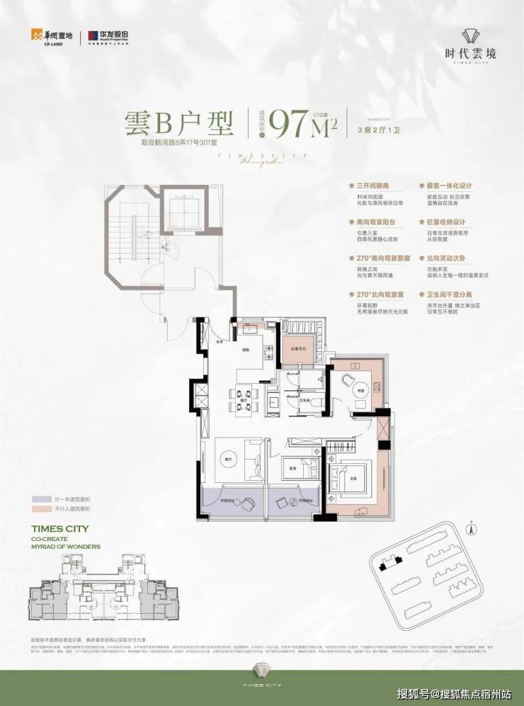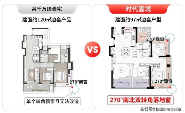 时代雲境建面约95-97㎡的房源不仅是边套,还设计了270°南北双转角落地窗。