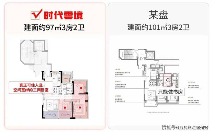 而得益于双约270°转角飘窗+南向双阳台的设计,时代雲境建面约97㎡产品,做到了3个卧室都能住人的“真三房”成交。