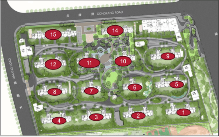 项目四至范围:东至15-06地块(公共绿地)、南至15-04地块、西至大康路、北至共康路,占地面积43500㎡,总建筑面积140051.13㎡,容积率2.20。