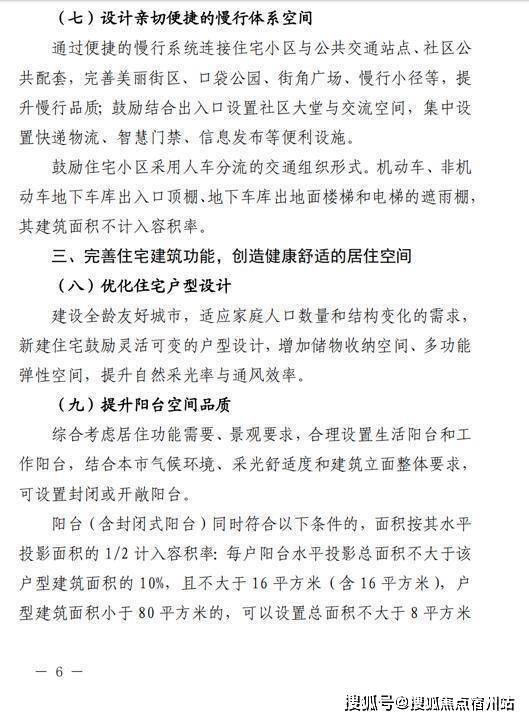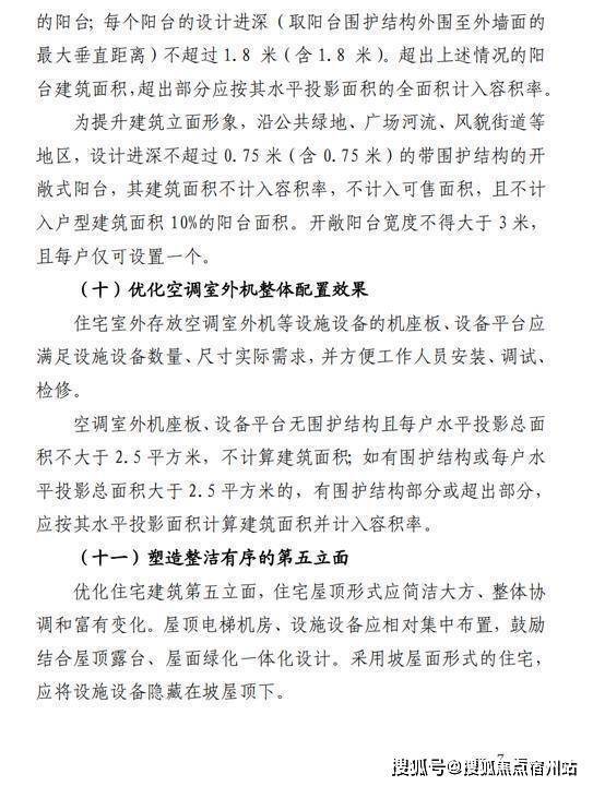此次新规提出的阳台设计变化最大。同时符合以下条件的阳台(含封闭阳台),面积按其水平投影面积的1/2计入容积率:每户阳台水平投影总面积不大于该户型建筑面积的10%,且不大于16平方米(含16平方米),户型建筑面积小于80平方米的,可以设置总面积不大于8平方米的阳台;每个阳台的设计进深(取阳台围护结构外围至外墙面的最大垂直距离)不超过1.8米(含1.8米)。