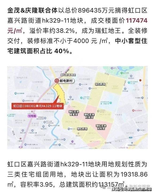 最新消息!10号线邮电新村站,上海2025年首个地王“瑞虹地王”——金茂+庆隆瑞虹项目正式定名「金茂·璞元」预计推售建面约120-140-180-200-250m²3-5房;装标4000元/m²;预计价格在16-17万/m²!