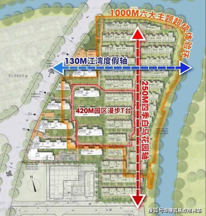 约130米的横向度假轴与约250米的纵向四季花园轴交织,串联起中央水景、阳光草坪、亲子游乐区等,与外部湿地公园呼应,形成“社区园林+外部生态”的双重景观体系,旨在实现四季有景、移步换景的梦幻居住体验。