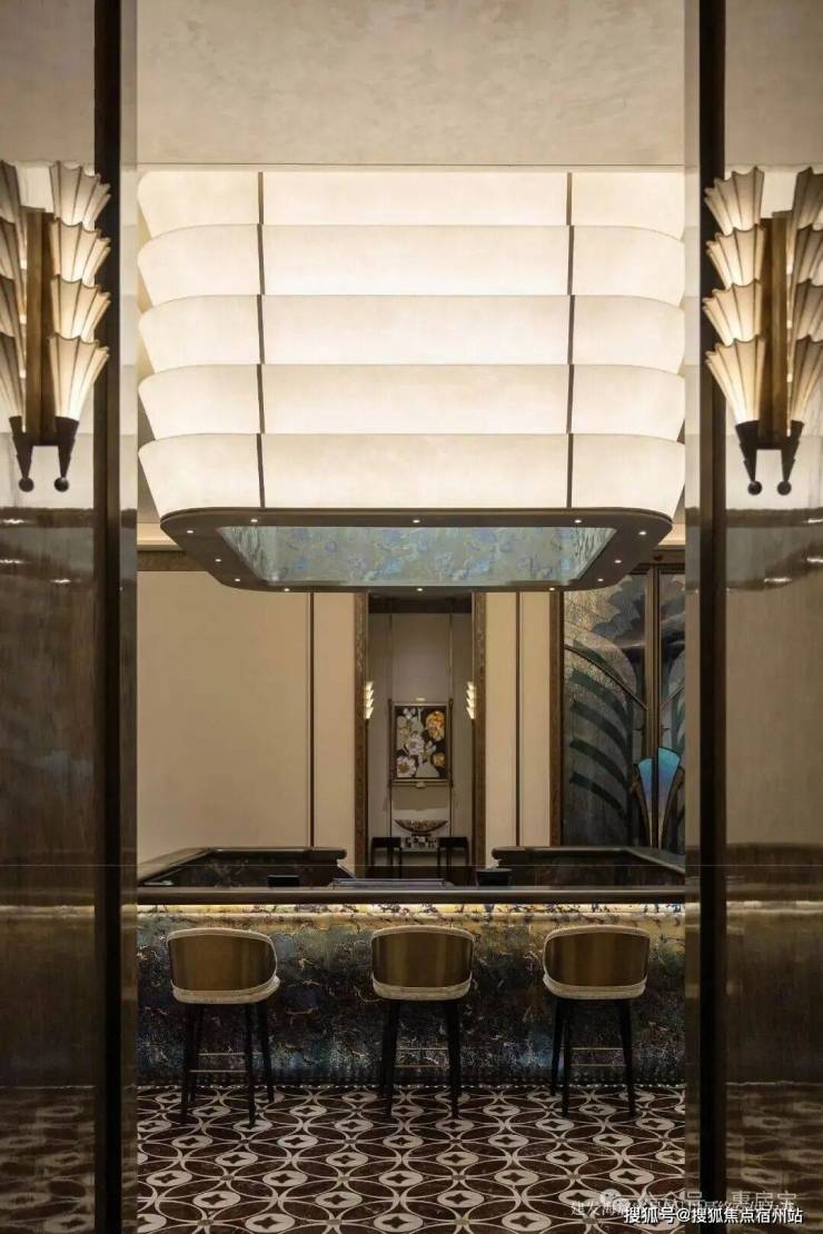 约9米挑高迎归大堂 致敬和平饭店经典风范,彩玻穹顶引天光入境,光影流转变幻, 百羽栖澜艺术雕塑 屹立中央,象征尊贵与祥瑞, 芦海宸韵非遗绣作。