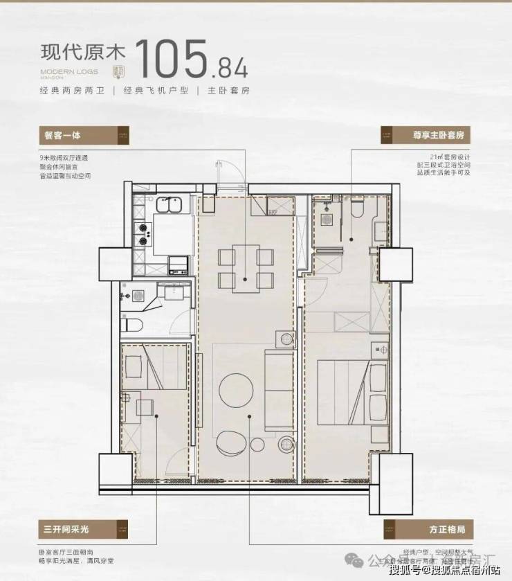 户型设计上,打破公寓常规暗间的局限,项目全部设计成全明2房或3房格局,做到没有一个暗间的居住空间,并全系标配主卧套房+双卫配置,提升居住配置。