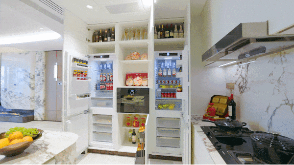 厨房藏着中粮北外滩壹号的生活洞察,艺术夹丝玻璃移门可开可合,嘉格纳双单眼灶+电磁炉适配中西厨,利勃海尔双冰箱,柏丽橱柜、升降篮、角柜小怪物把收纳玩成艺术。