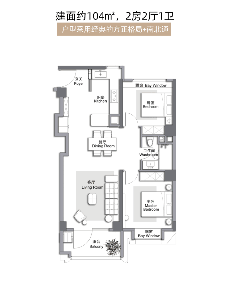 1、户型采用经典的方正格局+南北通,充分保障了充沛的采光与新鲜舒爽的空气。