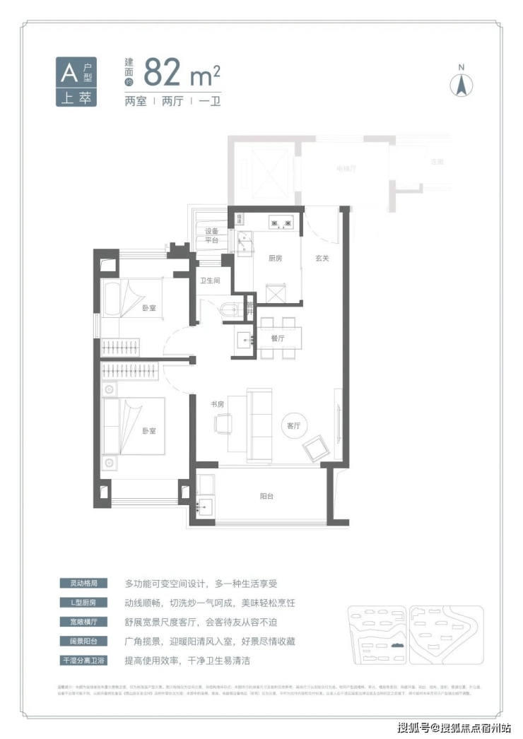 U型厨房、餐厅、客厅、阳台一线联通,南北通透。主卧套房、全卧飘窗、次卫干湿分离也都是标配。