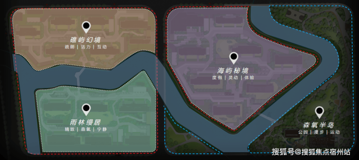 罕见双自然水系!一横一纵2条水系将项目地块一分为三,形成三座天然“岛屿社区”,这在市面上非常少见。
