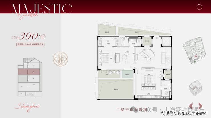 叠拼面积段约195-310㎡,分为1-2F下叠、3、4、5F为中间的平层面积236㎡,6-7F为上叠,计56套。