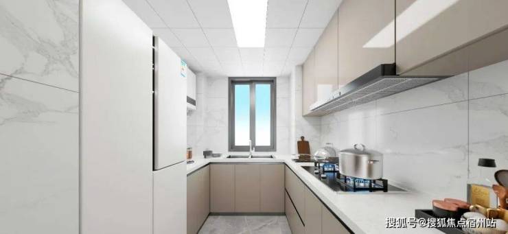 厨房为U型布局,配置 定制橱柜、老板烟灶、林内热水器 ,台面为人造石,水槽为邦克台下盆,细节处体现人性化考量。