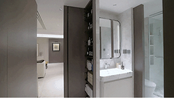 零食柜在华润置地的项目中或许并不稀奇,但这里的零食柜却有着独特的巧思,就连卫生间的墙体也成为收纳空间的一部分。