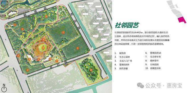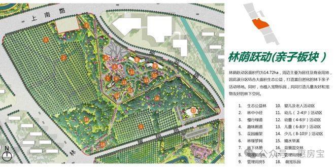 整座公园(在建中)划分为:湿地花园区、鸣湖共享区、林荫跃动区和社邻园艺区,四大功能分区。