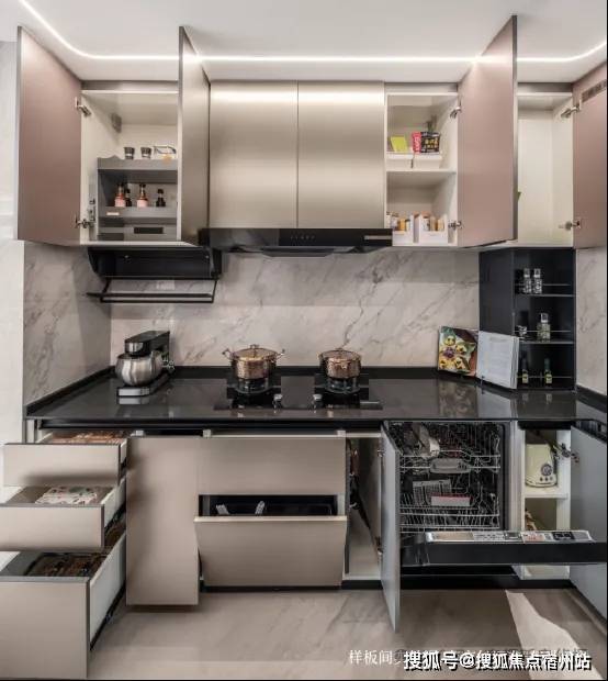 建发海宸巧妙利用空间拓展、功能分配、动线设置、超能收纳等实现了好厨房的“1步法则”,将操作步骤调配到舒适距离,让男女主人爱上下厨。