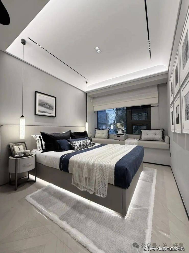 主卧转角落地窗+飘窗,也算是非常少见的了。净面宽约3.6m,不算进门的衣柜,进深大约5.7m左右。根据测算,可以放置宽约2m的床+2个床头柜(宽度约45cm/个)是可以的。