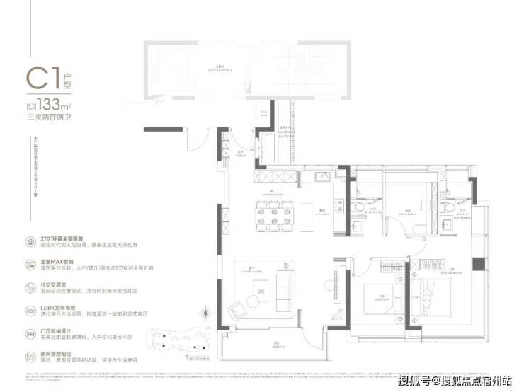 133㎡可以说是108㎡的进阶款,同样的三房两厅两卫,大面宽横厅、半开放式厨房设置岛台,加上主卧L型飘窗,再一次验证了华润置地豪宅化的产品思路。