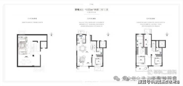 上叠:实现 2+1房2卫 设计,长辈房位于三层、配卫生间,规避上下楼梯的麻烦。 南向阳台与餐客厅一线贯通 ,享受充沛阳光。 四层豪华主卧、北侧连接露台, 空中露台及顶层阳光平台,可量身定制成一方幸福天地。