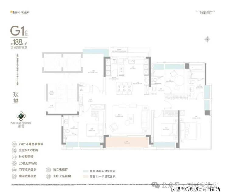 独立电梯厅+四开间朝南+双套房设计+豪华主卧的 约270°无柱转角飘窗,整个户型的尺度感拉满