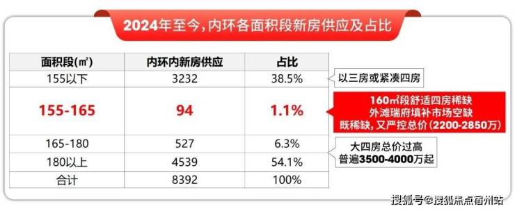 而在总价层面,外滩瑞府也是当下千载难逢的2200-2850万一步到位4房的机会。2024年至今,内环的四房供应起步面积段大约在180㎡,180㎡以上的四房供应占比55%,总价高昂,普遍在3500-4000万左右。