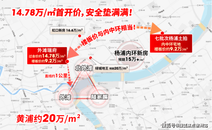 其次土拍层面:上海七批次土拍中,杨浦内中环宅地的楼板价已达约9.2万/㎡——这一价格,与外滩瑞府楼板价相当!