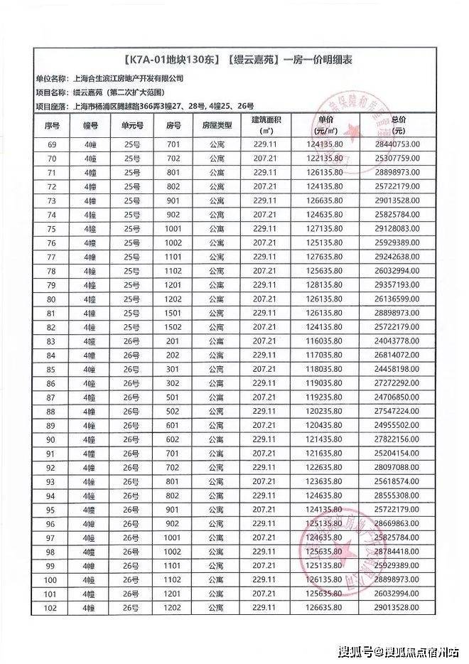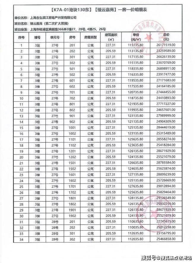 一房一价表如下