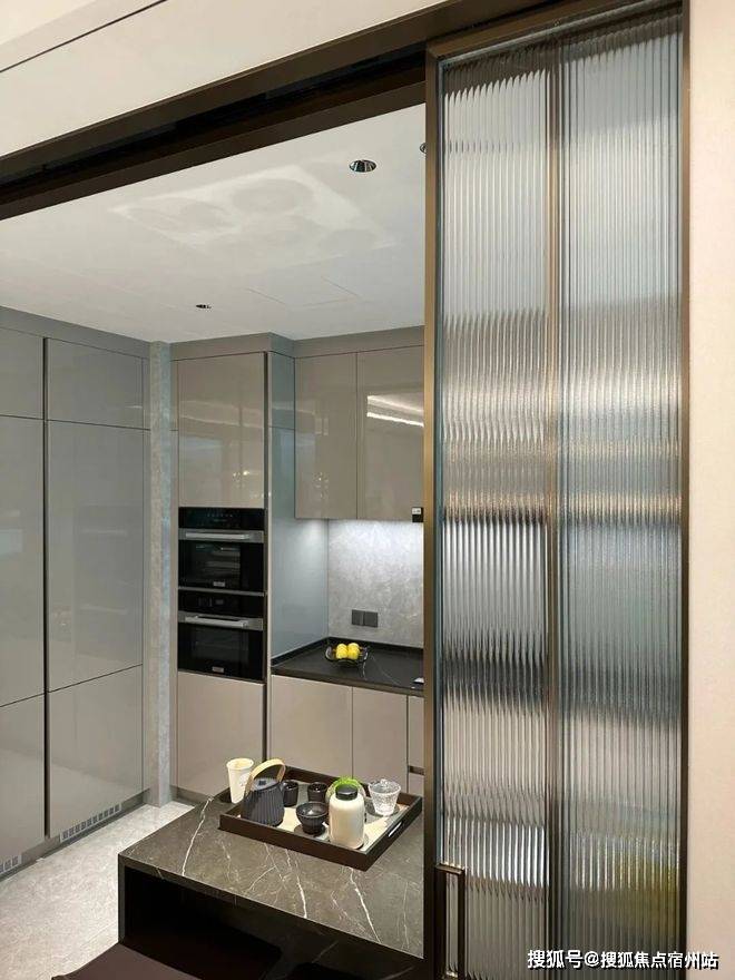 厨房玻璃门是上轨道移门,意味着地面部分没有任何轨道,不会有灰尘积攒,炒菜时关上,避免油烟散入室内;平时拉开,可以扩充室内视觉感受。