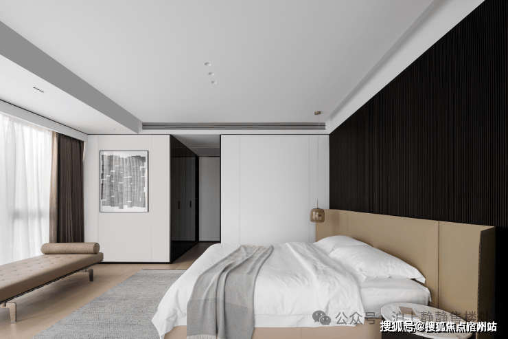 私密场域依旧保持静谧,黑白色基础上搭配了更多的色彩,例如深棕、浅紫等,艺术品的衬托深邃迷人,热络了家的氛围。