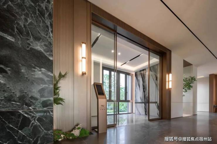 架空层入户门厅处,以普拉达绿奢石为背景装饰,提升了整体空间的质感,结合金属铝板装饰搭配,归家仪式感满满。