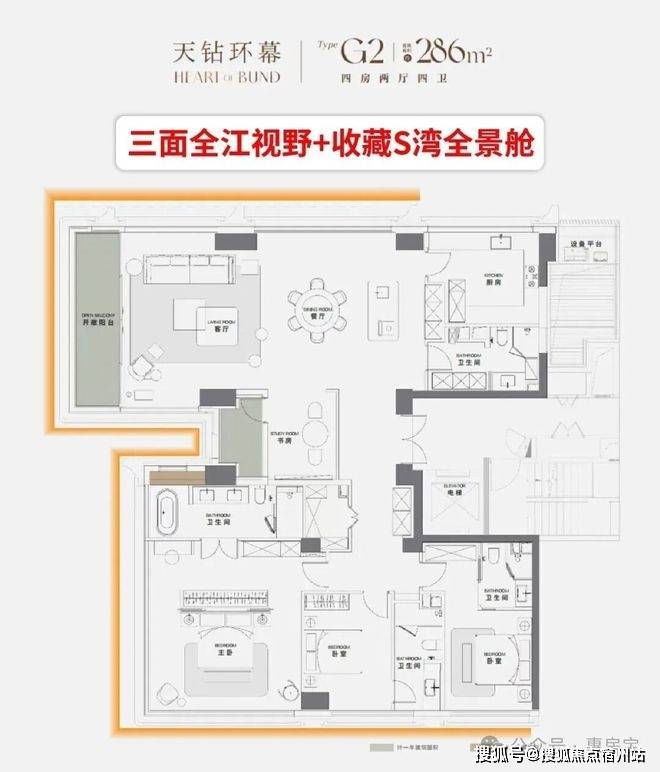 而且2号楼直面S湾,建面约286㎡户型又是三面看江,视野更加震撼!