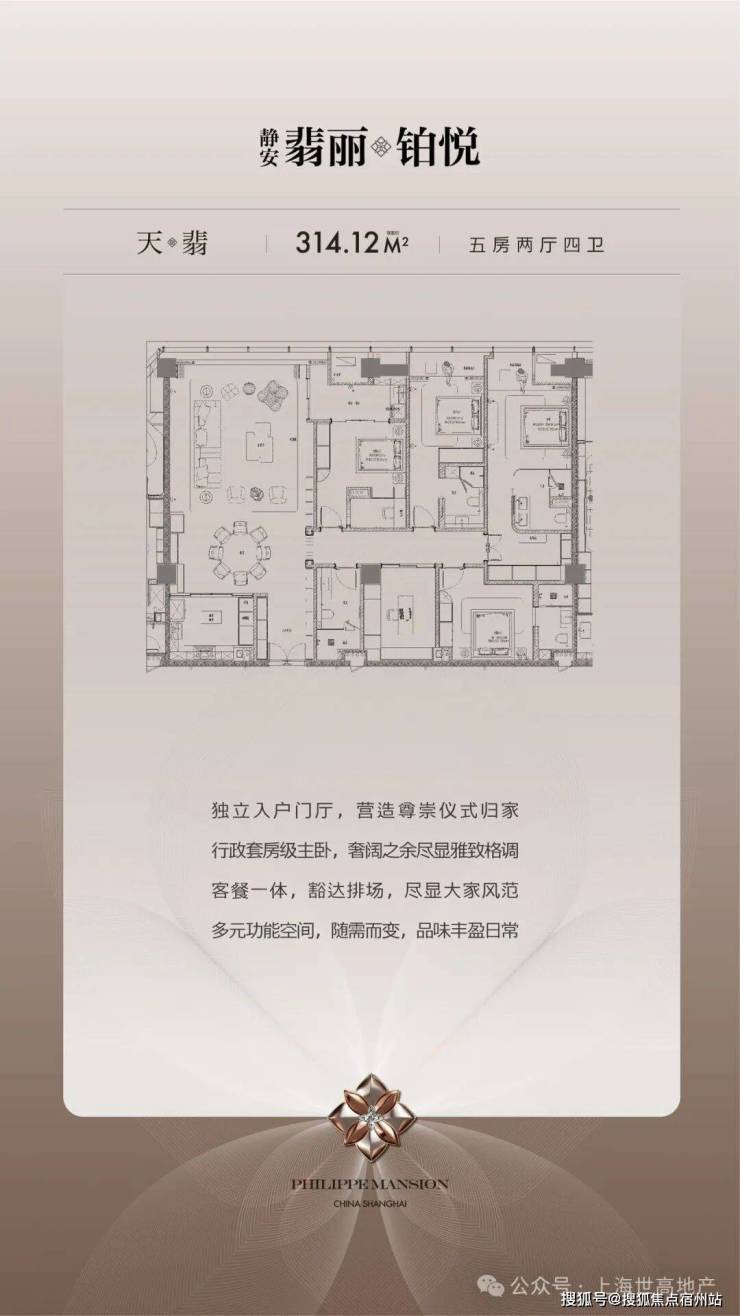 - 天翡314㎡:5房2厅4卫,独立入户门厅+行政级主卧套房,客餐一体设计彰显大宅风范。