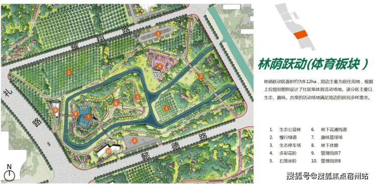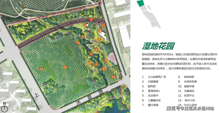 整座公园 (在建中 ) 划分为:湿地花园区、鸣湖共享区、林荫跃动区和社邻园艺区,四大功能分区。