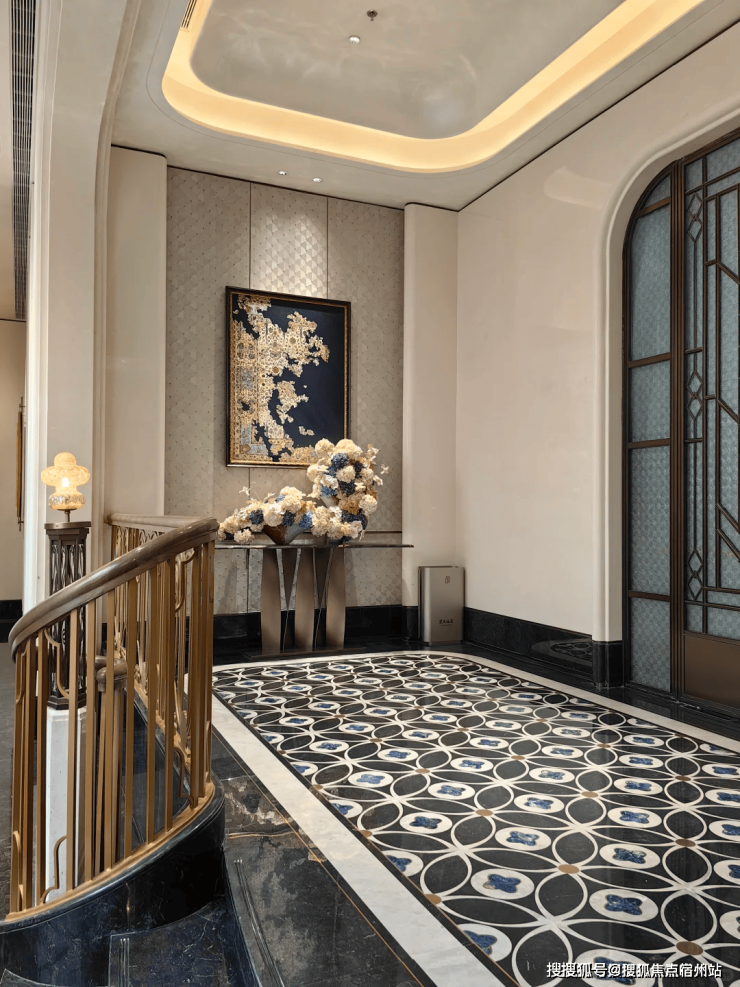值得注意的是,黑白拼花大理石地面也是一大亮点,纹理清晰、质感细腻,与蓝紫色渐变的雕塑形成鲜明对比,拍照时不用刻意避开地面,反而可以利用地面的线条和纹理,构图会更有层次感。而且雕塑的位置刚好在售楼处的核心区域,光线充足,不管是正面拍还是侧面拍,都能清晰捕捉到雕塑的细节和渐变色彩,出片率极高。