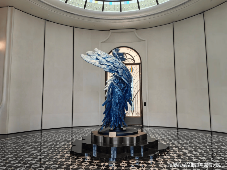 如果说彩绘玻璃穹顶是氛围感担当,那百羽栖澜雕塑就是高级感担当。这款雕塑是由当代艺术家与非遗大师跨界共创,整体造型流畅有张力,翅膀采用蓝紫色渐变设计,从浅蓝到深紫,过渡自然,质感细腻,在黑白拼花大理石地面的映衬下,高级感直接爆棚,不管是拍雕塑全景,还是结合雕塑拍人像,都能拍出极具质感的大片。