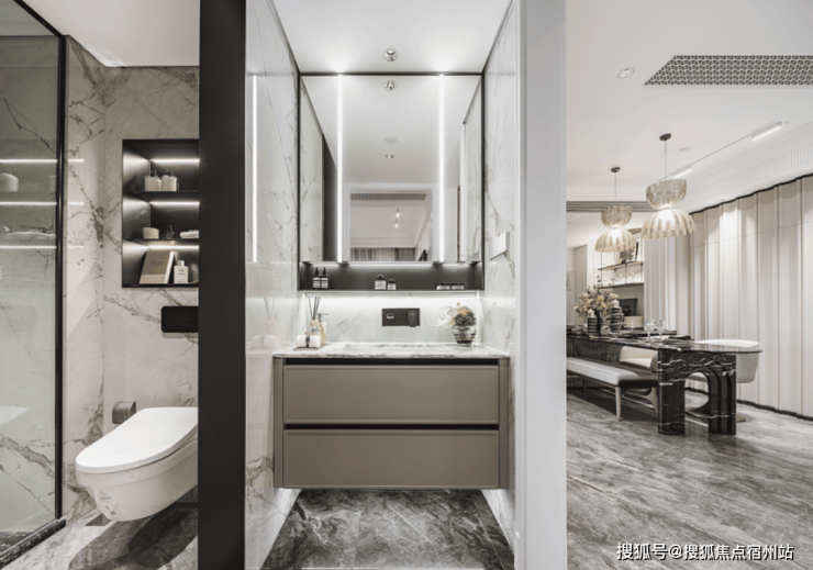 公区打造更是媲美奢华酒店,不仅有颜值,更有着满满的仪式感。嘉佩乐酒店风格的归家门厅,海派元素充满空间的每一个角落,地面的复古花纹,金属镂空装饰墙,普拉达绿的奢石点缀,仿佛穿越到了摩登时代。
