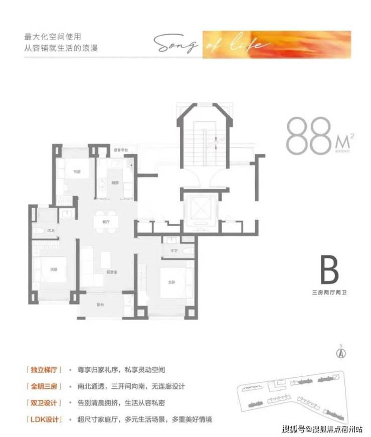 相较于市面上普遍的建面约88㎡只能做3房1卫的设计,该户型竟做到惊人的3房2卫!
