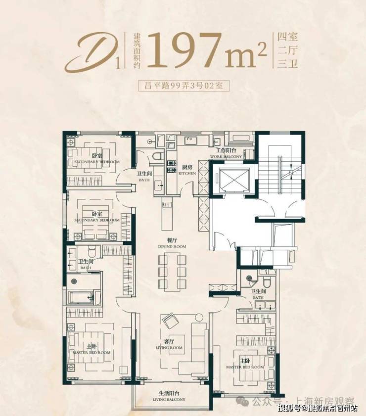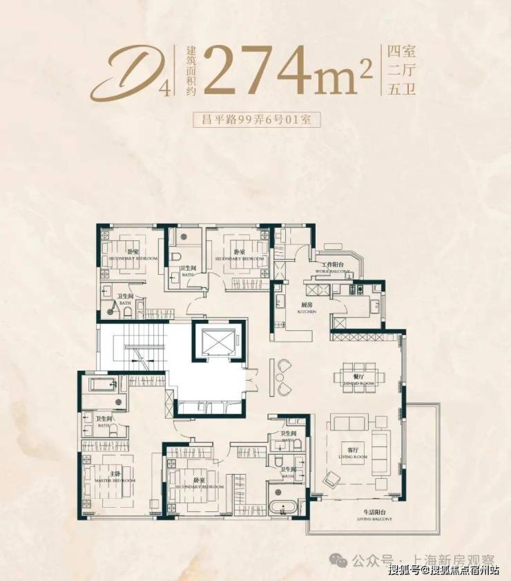 此户型最靠近苏州河,特地设计了 270度转角阳台直面苏河一线景观!4个套房设计,尊崇感十足!此户型仅有6套,珍藏属性拉满!