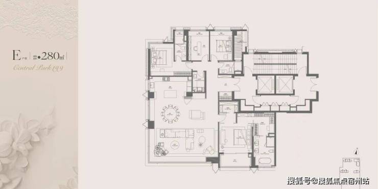 280㎡四房两厅三卫(楼王款,总价 3800-5000 万):270° 无遮挡公园全景,约 100㎡超大方厅,中西双厨 + 皇家白玉岛台,四套房 + 双衣帽间,打造终极改善顶配体验