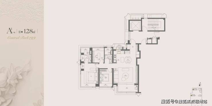 128㎡三房两厅两卫(入门款,总价 1436-1867 万):经典四叶草布局,零空间浪费,约 10.6 米南向面宽,大横厅连接观景阳台,双卧朝南 + 主卧套房,适配精英家庭改善需求