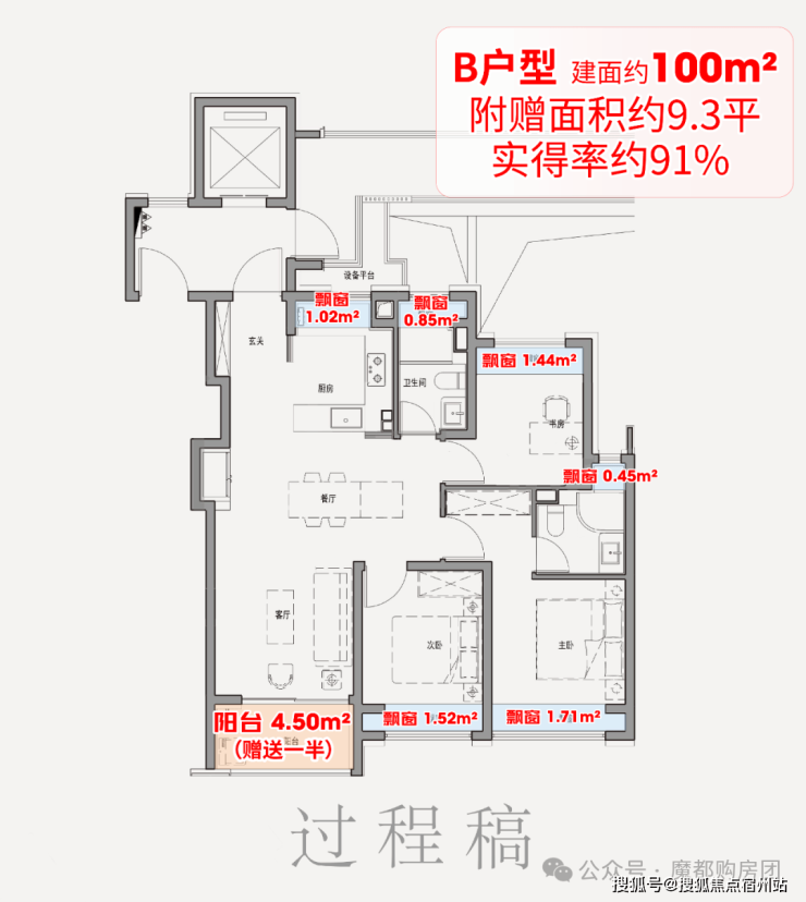 该户型满配6飘窗,比常规户型多2个卫生间飘窗、1个厨房飘窗;再加上阳台送一半面积,经过测算总赠送约9.3平,相当于一间次卧。