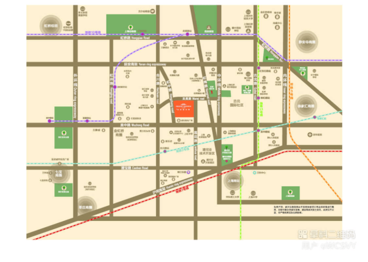 交通配套方面:项目地处长宁、徐汇、闵行三区交汇的金虹桥板块的核心区位,拥有多维立体的交通,延安高架、中环线、外环线环伺。