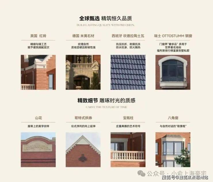 材料上甄选英国、德国、西班牙、瑞士等多国进口材料,红砖采用精细勾缝工艺,石材、屋面材料经久耐用,同源上海檀宫的瑞士OTTOSTUMM钢窗等优质建材,打造历久弥新的建筑。