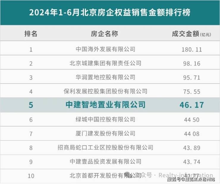 2024年1-6月北京房企权益销售金额排行榜中,中建智地以46.17亿,排名第五。