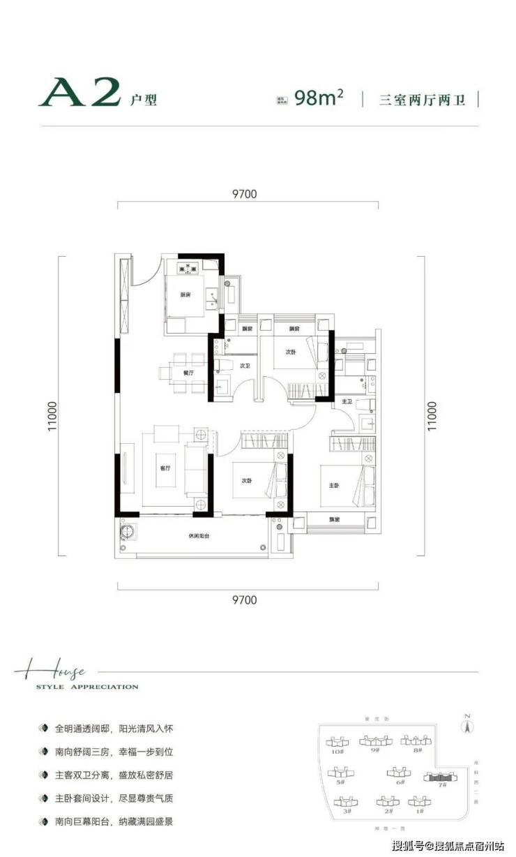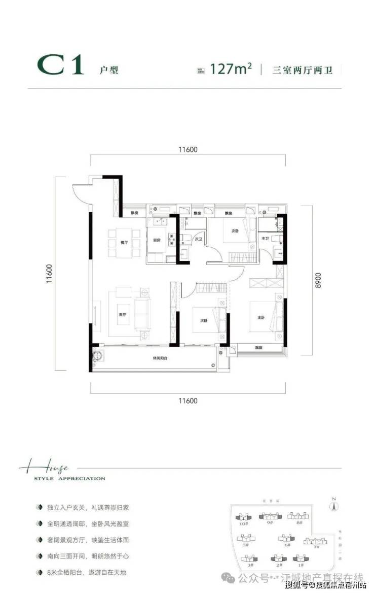 由9栋20-26层的高层组成,住宅容积率仅约2.5。在售建面约98㎡、110㎡、127㎡、140㎡四个户型,层高3米,远高于目前市面主流约2.8米。