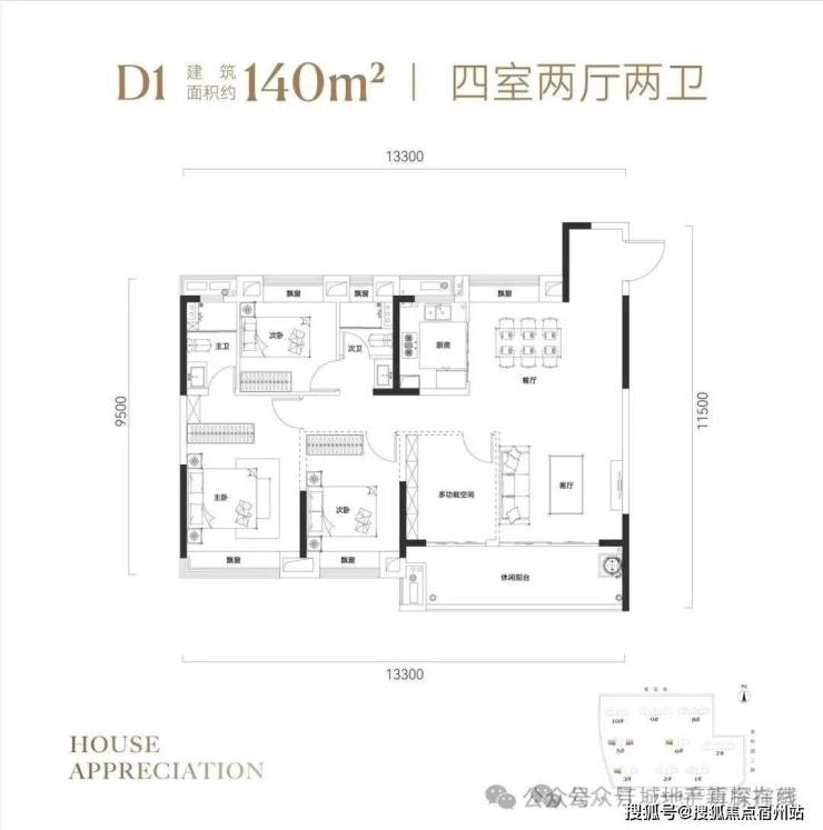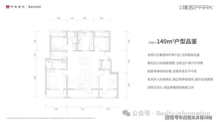 140㎡四室两厅两卫:是 125 平米的升级款,北向两卧室分置角落互不干扰,设备平台面积增加。客厅面宽达 5.75 米,入户有单独收纳间,北向次卧面积适中,适合二孩家庭。