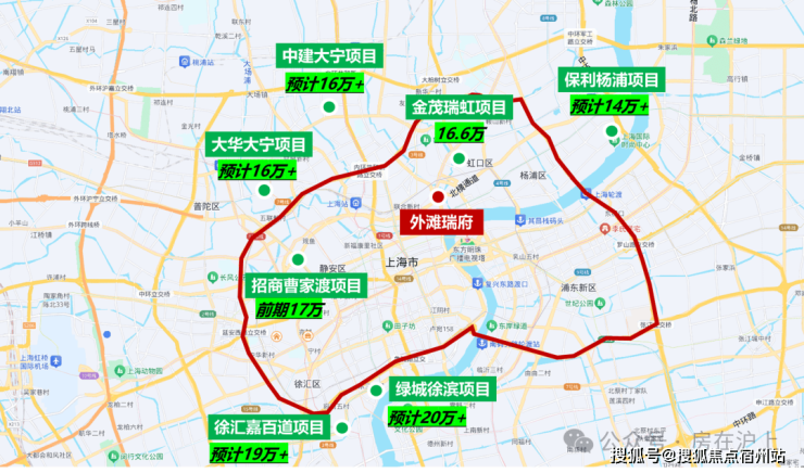 今年六批次土拍,绿城竞得北外滩新宅地,溢价率超过46%,未来售价预计突破20万元,它的位置就在「外滩瑞府」东侧约1KM。