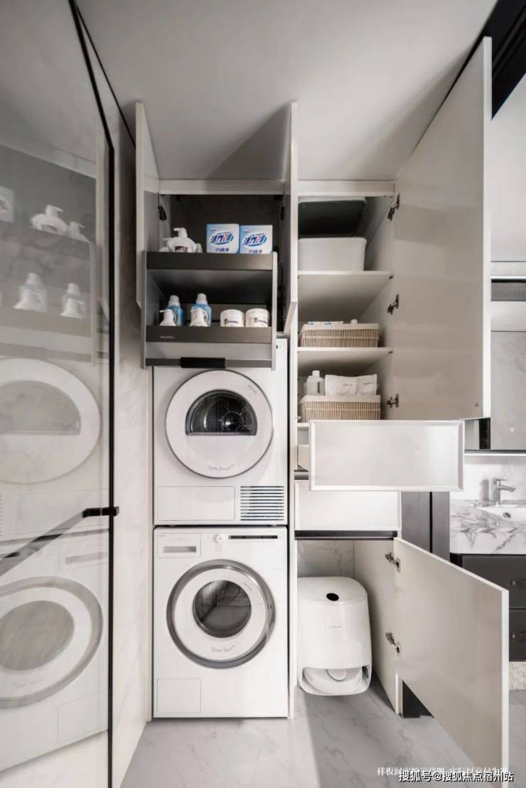 公卫还有全尺寸衣帽收纳空间以及配备洗烘套装的家政间,共同构成了一个高效、便捷的收纳体系。