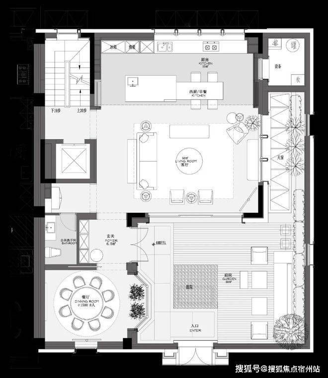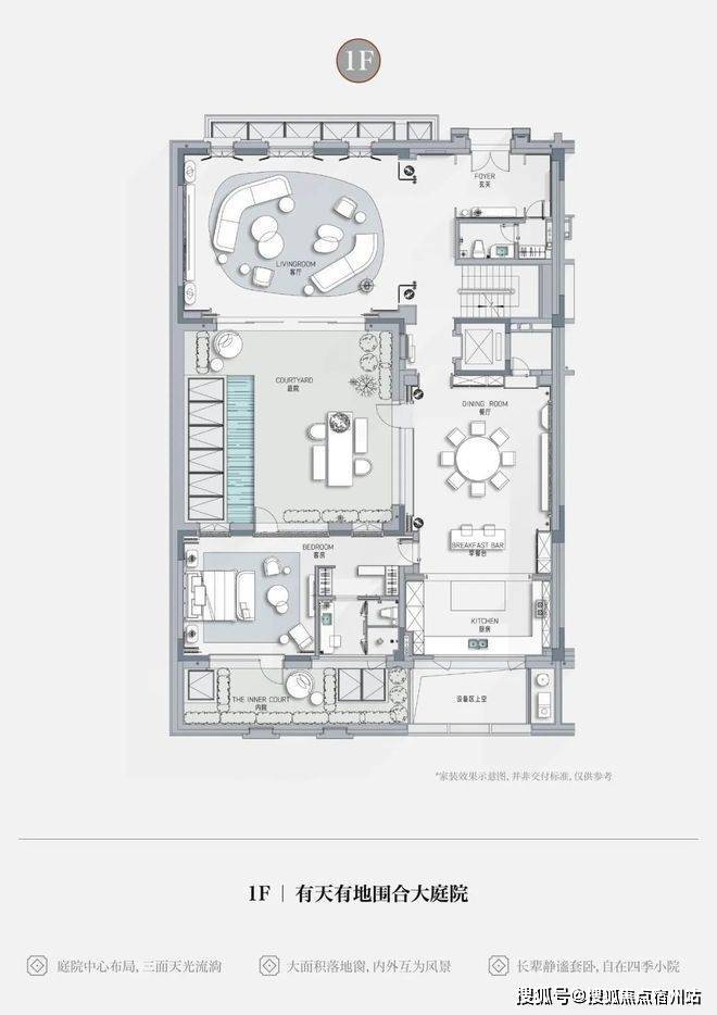 • 庭院中心布局,客厅、餐厅、卧室三面均可采光,内外相映成趣
